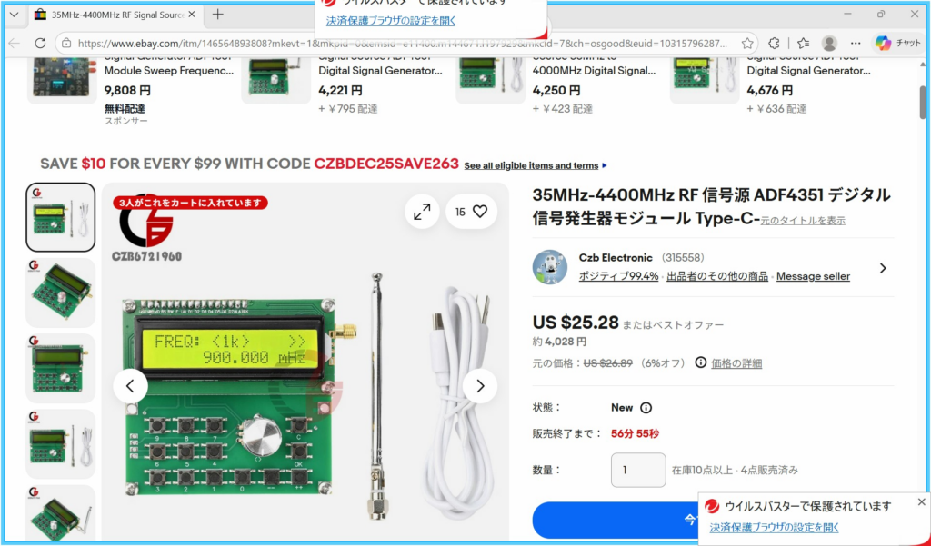 上記の『35MHz-4400MHz RF 信号源 ADF4351 デジタル信号発生器モジュール』を中国から購入しました。